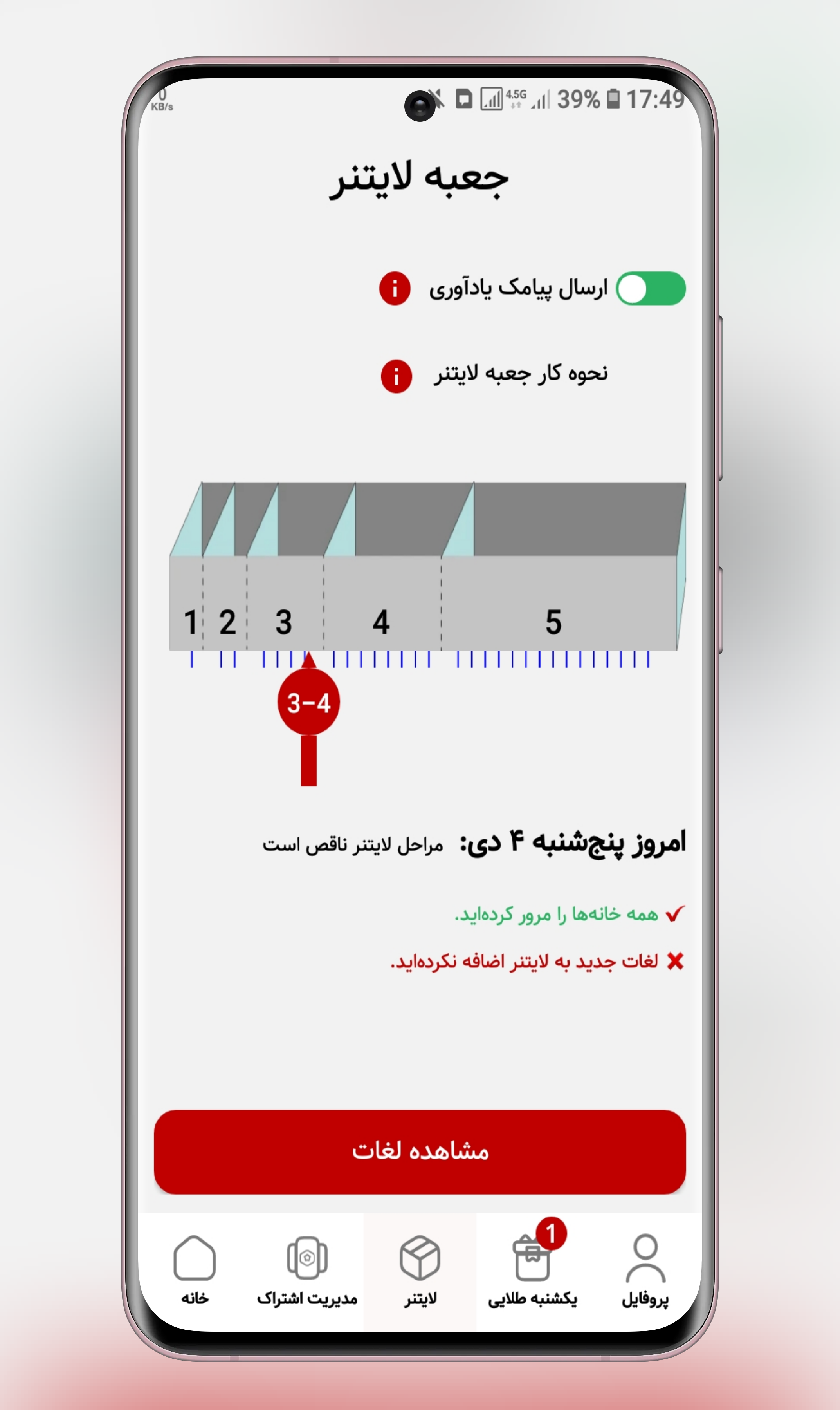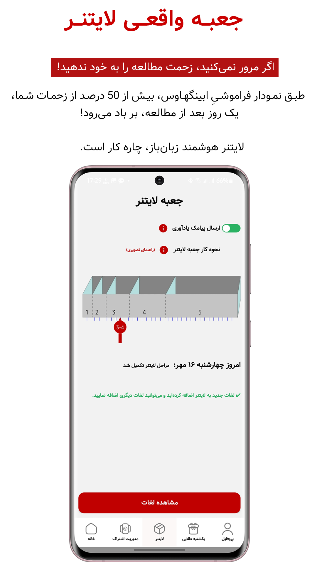 اگر تا ساعت ۸ شب مرور روزانه را انجام نداده باشید، با فعال بودن پیامک یادآوری، زبانباز به شما پیام میدهد. چون در لایتنر، تداوم روزانه مهمتر از هر چیز دیگری است