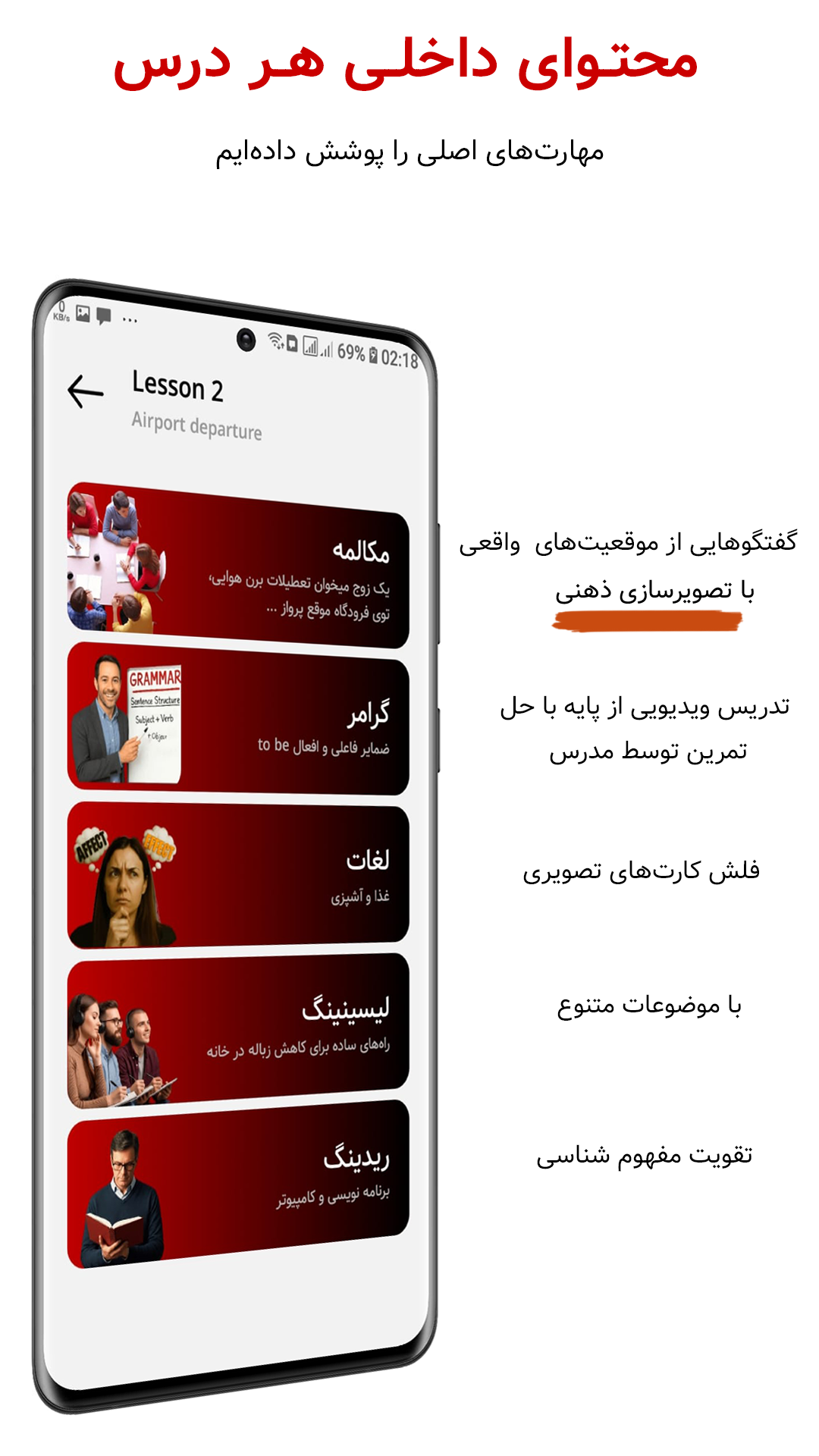 لغات در قالب فلش کارت به همراه تصاویر طراحی شدهاند که امکان بوکمارک، افزودن به جعبه لایتنر را برای یادگیری و مرور علمی فراهم میکند