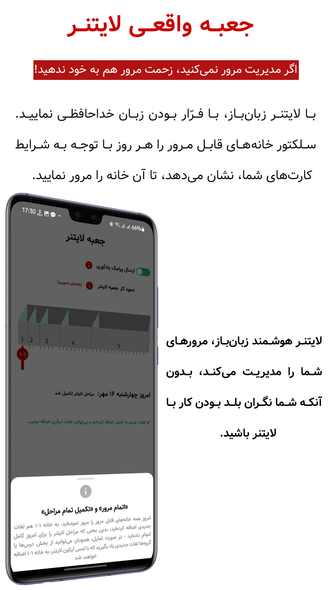 لازم نیست قوانین لایتنر را حفظ باشید. سیستم با پیامهای هوشمند، شما را قدمبهقدم راهنمایی میکند و اجازه نمیدهد مسیر را اشتباه بروید