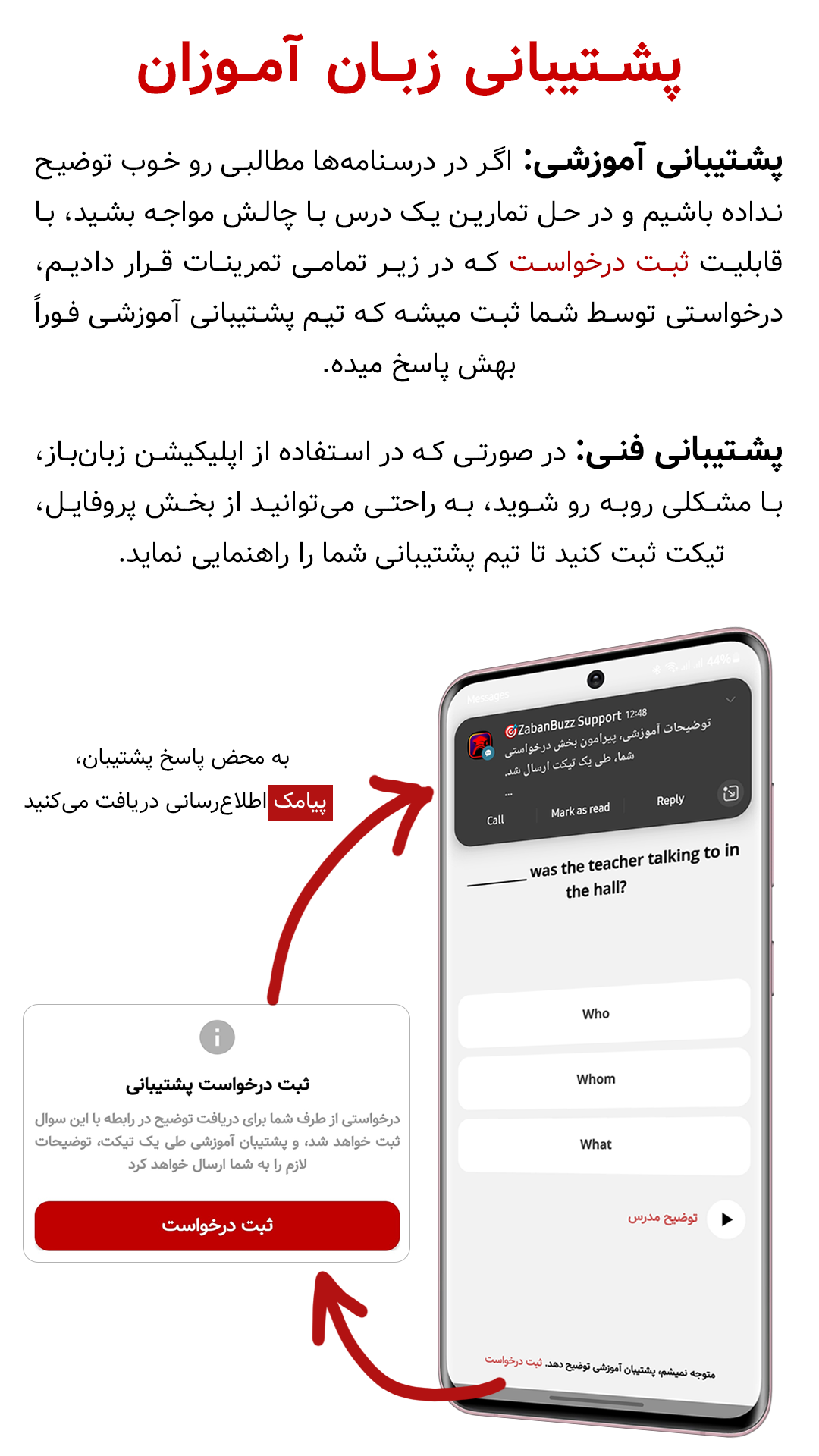 سریعترین راهی که میتوانید با تیم پشتیبانی زبانباز در ارتباط باشید، ارسال تیکت از قسمت، پروفایل - پشتیبانی (ثبت تیکت) از داخل خود اپلیکیشن زبانباز میباشد. همچنین تمرکز اصلی ما در پاسخگویی به کاربرنمان بخش تیکتینگ اپلیکیشن میباشد